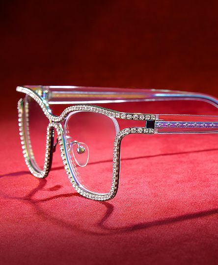 Diese Metallrahmen vereinen futuristischen Glanz mit zeitlosem Luxus. Die quadratische Silhouette mit galvanischer Beschichtung weist schillernde Ränder auf, die mit Kristalldetails verziert sind. Das Gestell ist von der Ästhetik der Abendmode inspiriert und verleiht jedem Ensemble einen raffinierten Glanz.